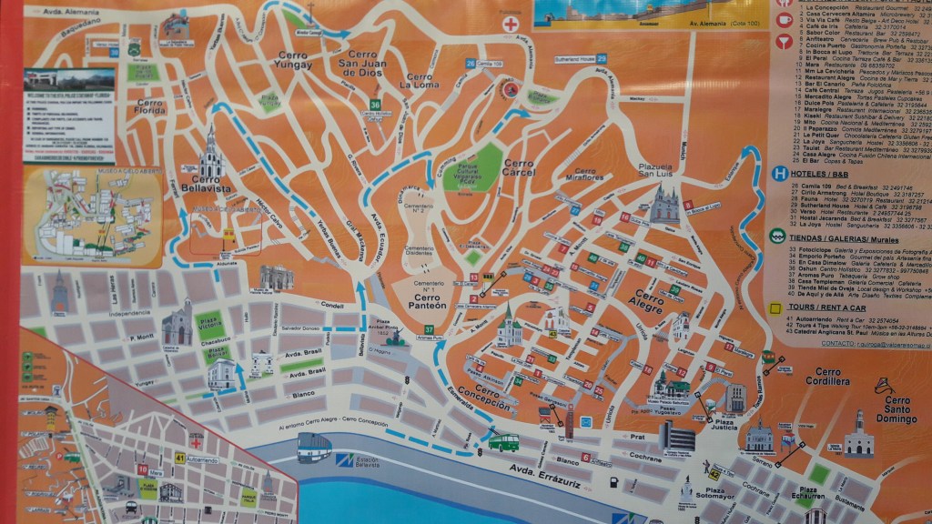 Os Ascensores são os elevadores que levam você até os Cerros que são a melhor parte de Val Paraíso. Morros, com ruazinhas estreitas e lindas, com casinhas coloridas e bistrôs maravilhosos. Subimos pelo Ascensor que cobra uma taxa pequena e fomos simplesmente desbravando os morros, pelas vielas e descobrindo surpresas nesse lugar, além de aproveitar a vista. No finalzinho de tarde vale a pena um cafezinho no Café Vinillo que fica na Almirante Montt, uma das ruazinhas principais lá do Cerro Alegre.