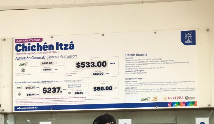 Bom, ao chegar na bilheteria já separe o valor para pagamento. A parte do ingresso de entrada você pode pagar no cartão de crédito se quiser. Mas a parte do imposto do governo você precisa pagar em pesos mexicanos e em dinheiro. Nós fizemos isso.