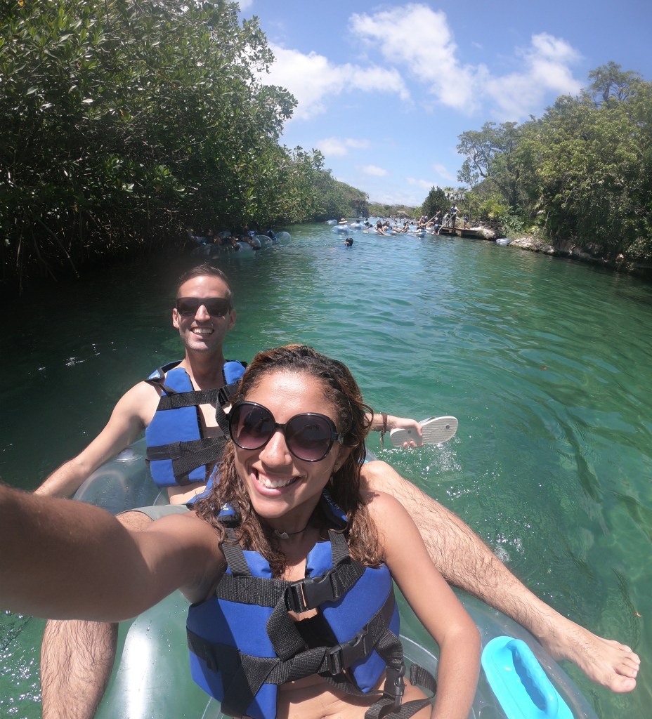 Bom, o Xel-há é um parque que tem mais atrações de aventura. Inclusive, tem uma área chamada exatamente de “Mundo da aventura”. Lá tem várias atividades legais na água, como tirolesa, atividades de corda, salto e a famosa bóia para passear pelo rio. A gente foi umas 5 vezes só na tirolesa…hehe