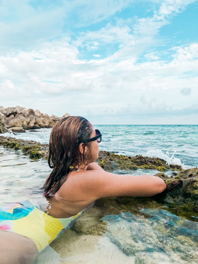 Bem pertinho da hora que a galera já estava se preparando para o show meu marido descobriu um cantinho perfeito no parque que não vi aqui em nenhum blog. Fomos para lá aproveitando que já estava bem vazio e ficamos com a piscina praticamente natural só pra gente por quase 1 hora. Eram as famosas “Pozas Naturales”! Procure por elas no mapa e passe lá para uma visita. O mar estava super calmo então foi ótimo. Mas quando o mar está mais agitado eu não sei se eles deixam aquele local aberto. Tinham alguns salva-vidas por lá.
