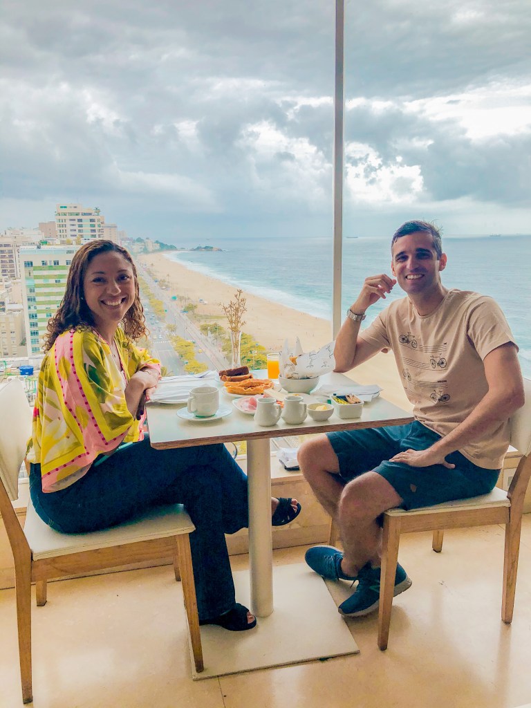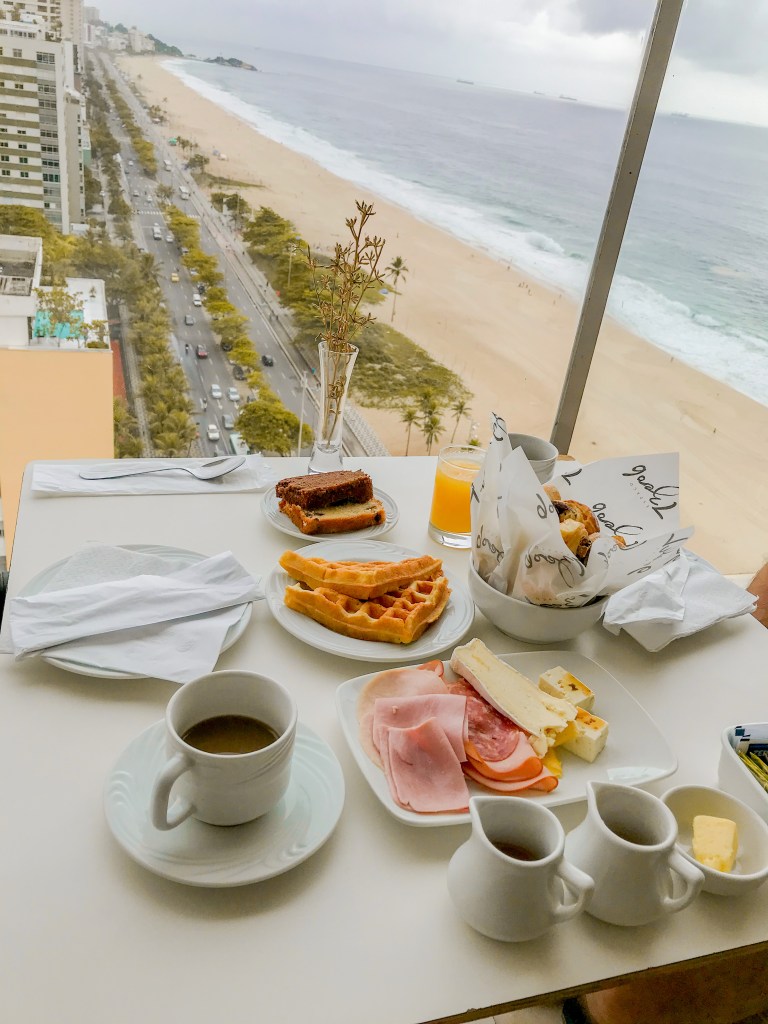 Agora se você quer uma vista completa da Lagoa e Ipanema, do alto e com um café da manhã especial esse é o seu lugar. O espaço fica no topo do Praia Ipanema Hotel e tem uma vista incrível. O café da manhã completo tem diversas etapas com frutas, pães, iogurtes, queijos, embutidos, mini pratinhos quentes. É uma delícia.