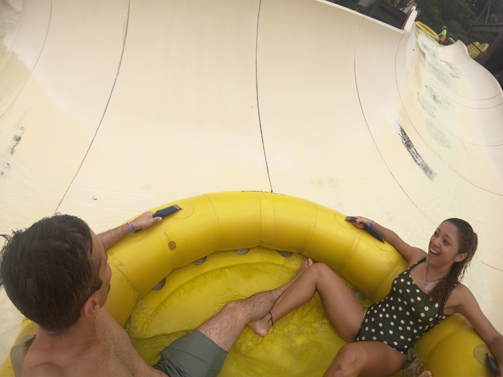 Fomos na tirolesa (uma das mais altas que já fui, adorei! Quase não desci…heheh), no toboágua com bóia, naquele que desce com uma “pranchinha”, e nos toboáguas fechados. Só não fomos nos de queda livre que eram a diversão dos adolescentes por lá!