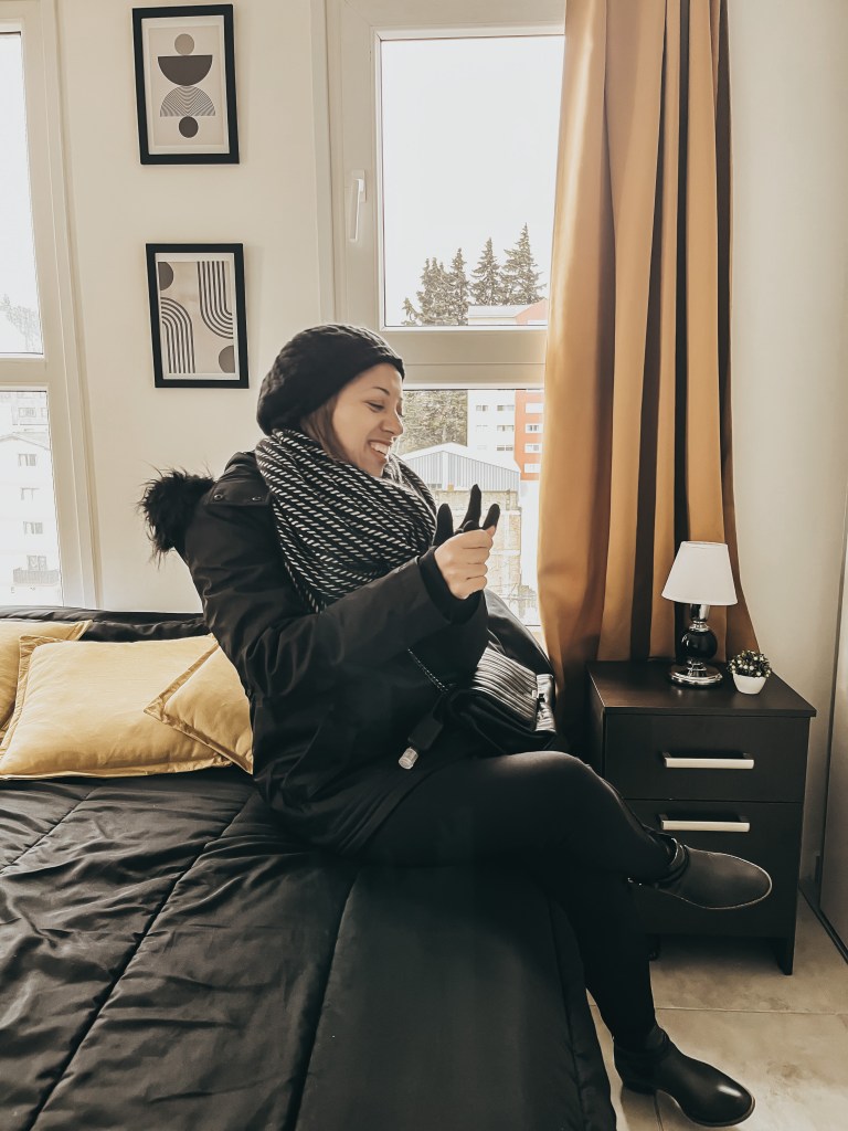 Fizemos o check-out no nosso airbnb para podermos ficar a vontade para tomar café (o horário de entrega das chaves era cedo) e estacionamos o carro num estacionamento privativo que tinha bem em frente. Fomos na Western Union que já tínhamos ido no primeiro dia e não tinha dinheiro lá…hehe. Procuramos qual seria a outra mais próxima e fomos até ela antes mesmo de tomar café para resolvermos logo essa questão. E deu tudo certo. Encontramos uma que além de estar vazia e ter dinheiro era do lado de um café super lindinho que com certeza não teríamos conhecido se não fosse por esse “pequeno perrengue”. Pra mim não foi perrengue, foi benção. Chegamos na cafeteria Belakay e simplesmente a melhor mesa estava sendo desocupada naquele momento. Sério, gente! Que presente. Tomamos um café delicioso com a neve caindo lá fora. Não tinha jeito melhor de finalizar essa parte linda da viagem.