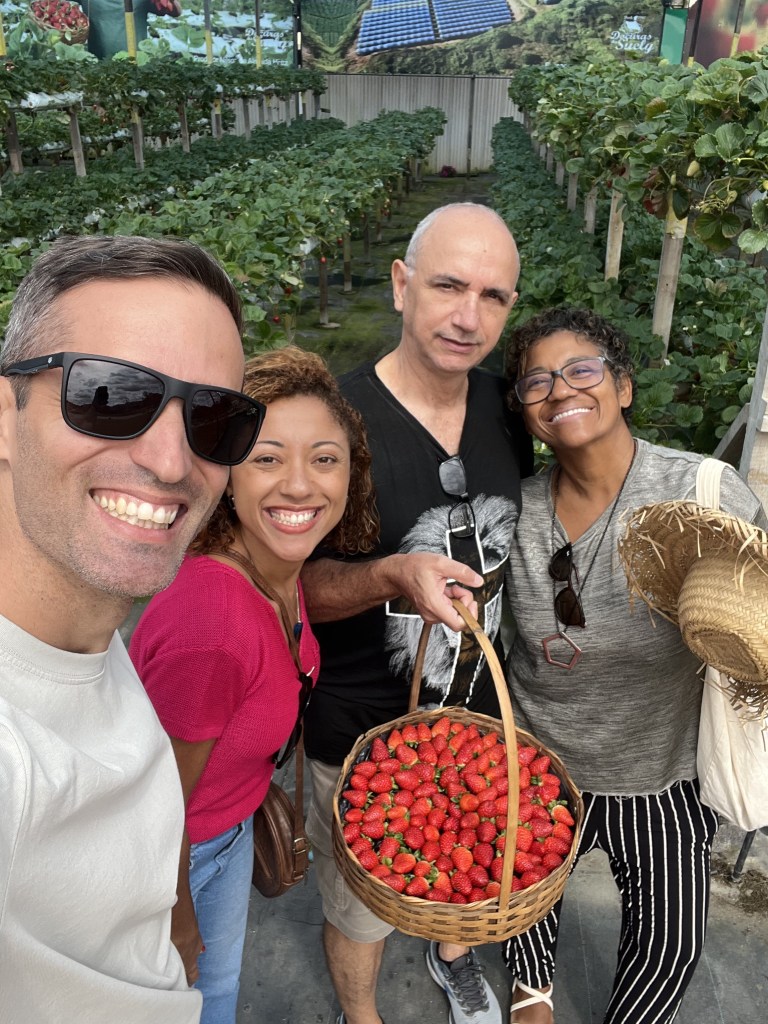 Saímos de lá por volta das 9h30 e fomos direto até a Plantação de Morangos – Doçuras da Suely. Já tínhamos ido a uma plantação de Morangos em Itaipava mas a de lá era bem simples (e bem bonitinha também ainda assim). Mas essa tinha uma estrutura maior, com uma lojinha que também funciona como café onde você pode experimentar várias coisinhas deliciosas como tortas de morango e até coxinha de morango. Além de ser um ótimo lugar para comprar geleias fresquinhas e artesanais.