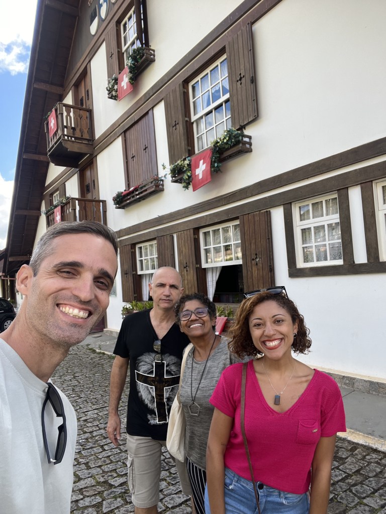 De lá, fomos até a Casa Suíça. O espaço possui um museu com uma exposição bem legal, uma lojinha, uma mini fábrica de chocolate e ao fundo ainda tem um restaurante e um galpão cheio de barraquinhas de artesanato. Ficamos lá por um bom tempo curtindo o lugar.