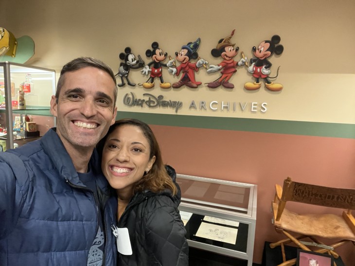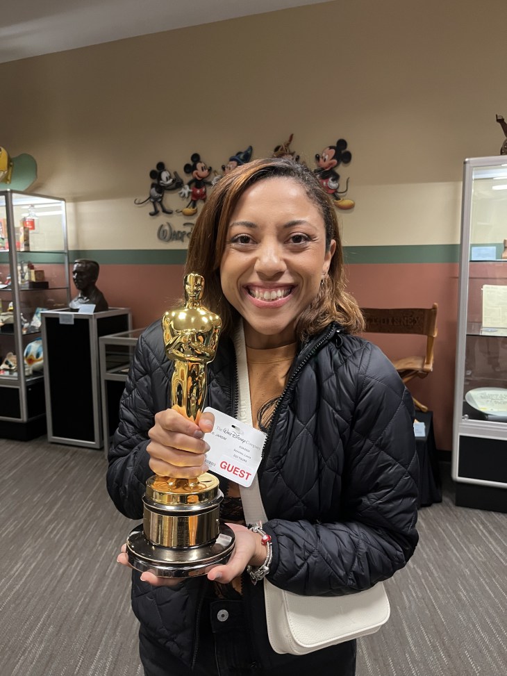 De lá fomos até o escritório do Walt Disney Archives e ali foi um ponto alto que eu nem esperava. Vimos as máquinas de animação da empresa, alguns documentos históricos, prêmios que a Disney já ganhou e tivemos a oportunidade de segurar um Oscar da Disney. Isso mesmo que você leu: seguramos um Oscar da Disney!