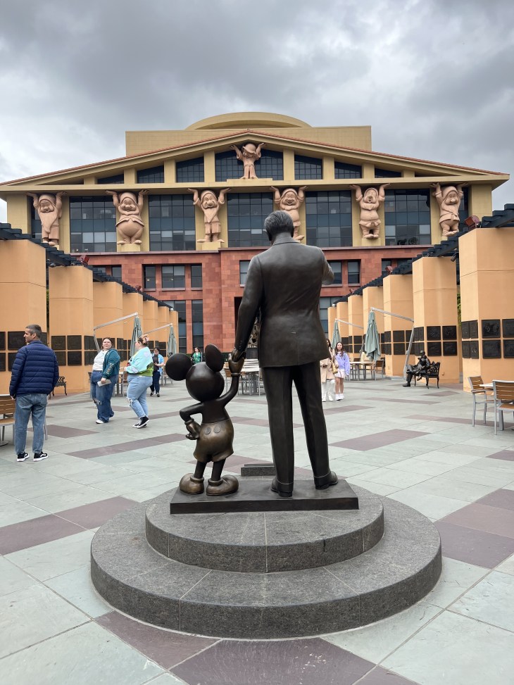 Essa praça é tão significativa e contém tantos símbolos: Os sete anões sustentando a sede da companhia para mostrar a importância do filme “Branca de Neve” para a Disney; A famosa estátua de Walt com o Mickey para mostrar como o Mickey foi onde tudo começou; A estátua de Roy com a Minnie dando o reconhecimento da extrema importância dele pra companhia; e em cada uma daquelas pilastras o reconhecimento a pessoas que são bases para o sucesso da Companhia até hoje.