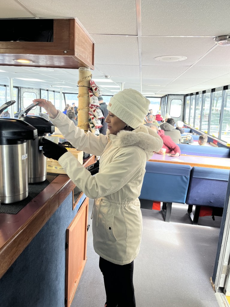 Dentro do barco tem banheiro, uma lojinha com alguns snacks e produtinhos a venda e também chocolate quente (imprescindível para o vento gelado que fica no percurso) e as torradinhas com pastinha de salmão, esses últimos já estavam incluídos, não precisava pagar.