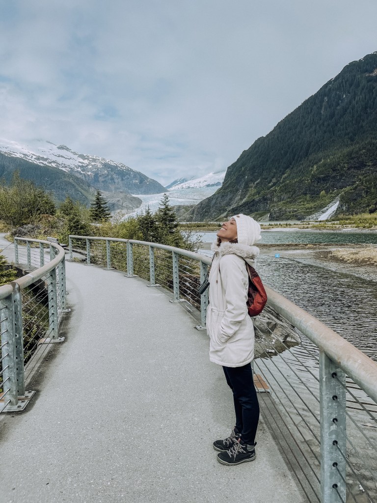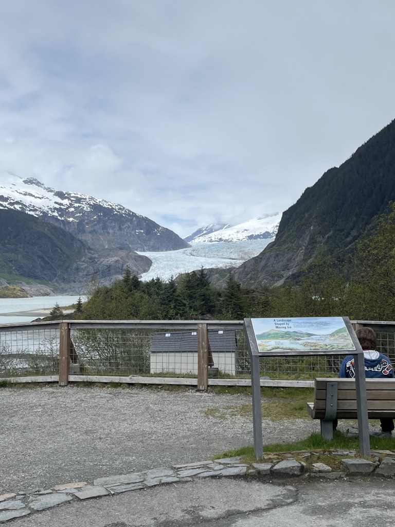 O local tem várias trilhas e um centro de visitantes estilo museu com muitas curiosidades. Eu confesso pra vocês que amei tanto estar lá que eu queria muito ter ficado lá o dia todo. A Disney só nos deu 1 hora no local. Aí repito, se eu soubesse que já teríamos visto baleias no dia anterior teria ido apenas para esse lugar (o que no caso nem precisaria de passeio da Disney, pois tem vários ônibus de passeio no centro de Juneau que levam pra lá). Teria dado tempo de fazer pelo menos umas 2 trilhas e ainda ter visitado com mais calma. Mas, fica para uma próxima oportunidade. Fizemos apenas a trilha curtinha que leva até a geleira e photo point e já foi incrível.