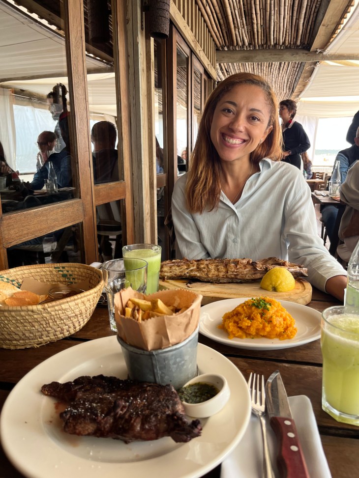 Eu e meu marido não somos muito de fazer reservas de restaurantes em viagens, a não ser que seja algo realmente muito específico. A gente gosta de ficar bem livre para decidir o que comer simplesmente olhando para a carinha do lugar e decidindo na hora e onde estivermos. Costumo, no máximo, pesquisar algumas indicações de lugares imperdíveis mas sem a obrigatoriedade de comer neles, sabe? Costuma ser mais do tipo: se calhar de estarmos por perto no momento a gente vai. Mas esse restaurante precisa estar na lista e como era muito difícil conseguir uma mesinha nele sem reserva, fizemos (contra a nossa vontade mas fizemos heheheh). Estava pertinho do meu aniversário então escolhemos ele como uma comemoração adiantada. Estou falando do Parador La Huella. Quem já conhece a gente e nos acompanha há tempos por aqui sabe que comer faz parte da nossa experiência turística por onde quer que viajemos. A gente gosta de comer bem, de experimentar coisas novas e de voltar em lugares queridos. Quando estávamos pesquisando dicas de Jose Ignacio vimos que o La Huella foi reconhecido como um dos 20 melhores restaurantes da America Latina no famoso “The World’s 50 best” (posição de 2024), uma premiação grandiosa para um restaurante a beira-mar. Ele é super charmoso com uma decoração rústica lindíssima e perto de outras lojas de decoração maravilhosas. Fizemos a reserva e almoçamos lá. O atendimento é bom, a comida é bem servida e gostamos pois não tem aquela presunção de restaurantes de chef sabe? Eles mantém a rusticidade dos pratos de um restaurante típico de praia mesmo. A comida não é nada demais viu? Os preços são bem superfaturados e o prato estava até meio sem sal (literalmente). A carne que meu marido pediu estava boa mas achamos a do Mercado del Puerto em Montevideo muito melhor hehe. A sobremesa famosa vale a pena demais: deliciosa. O resumo da experiência pra mim é que vale a pena ir pelo menos uma vez na vida. Voltaria? Não sei…talvez não. Mas valeu a experiência da refeição pelo lugar que é lindíssimo, as vezes comer é sobre isso também.