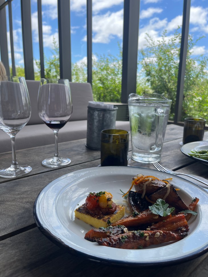 No final do tour fomos para o restaurante onde acontece a degustação. Eles trazem todos os tipos azeites, os vinhos e algumas torradinhas para você experimentar. Tudo maravilhoso. Os azeites são incríveis. Quando estávamos lá eles nos informaram que se quiséssemos também poderíamos almoçar no local. No dia que fomos você poderia escolher uma proteína e até 3 acompanhamentos em um buffet que parecia delicioso. Quisemos completar a maravilhosa experiência e entendemos nossa visita para o almoço. Almoçar lá também foi maravilhoso, a comida estava incrível e eles ainda me deram uma surpresa para cantar “Parabéns” pelo meu aniversário.