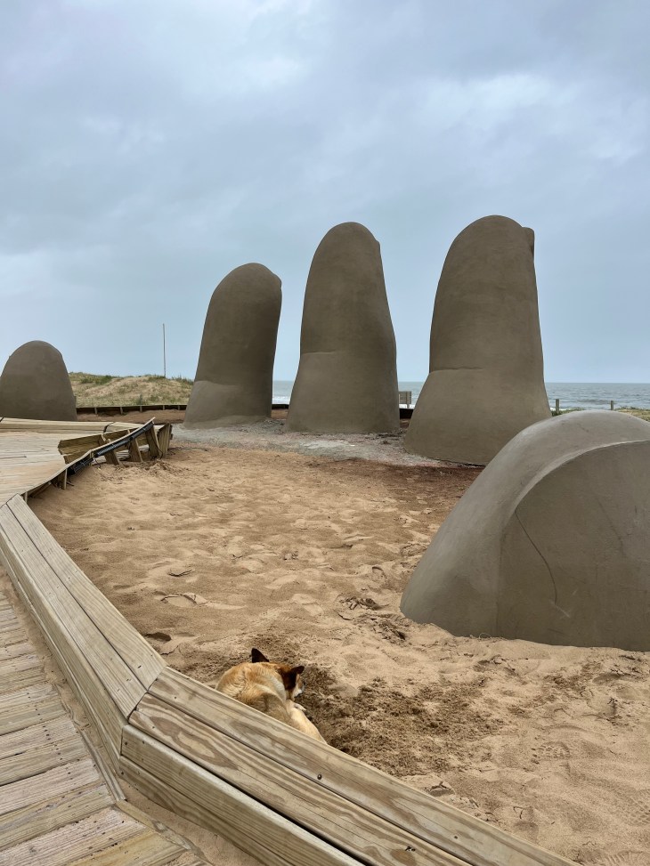 De lá fomos para o centrinho de Punta e estacionamos perto da Avenida Gorlero (a principal de Punta) para tirarmos foto na famosa escultura dos 5 dedos. Estava chovendo bastante no momento, o que permitiu que tirássemos a foto tranquilamente praticamente sozinhos. Dali fomos caminhando pela Avenida principal para escolher um local para almoçar. Comemos no Ola la Restô, um bistrôzinho que tinha uma comida mais caseirinha e estava gostosinho. Tinham muitos lugares fechados e vários a gente não gostou muito vendo de fora. Aproveitamos e tomamos um sorvetinho de sobremesa na El faro logo em frente.