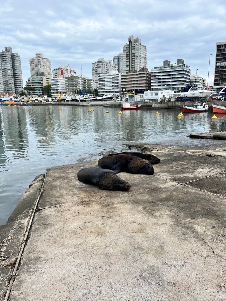 Saímos de lá e fomos caminhando pela Avenida até chegar em um ponto que desse para descer até a Orla e fomos no píer do porto de Punta para ver os Leões Marinhos. Achei incrível. Eles estavam dormindo quando chegamos lá e foi muito bom vê-los lá no habitat natural deles tão tranquilos. Paramos na Medialunas Calentitas e pedimos umas pra viagem e fomos degustando medialunas passeando pela Orla até chegar em um outro píer bem bonitinho.